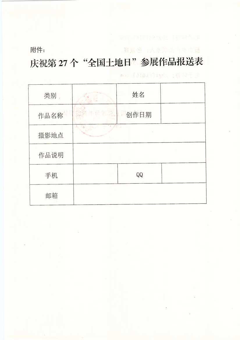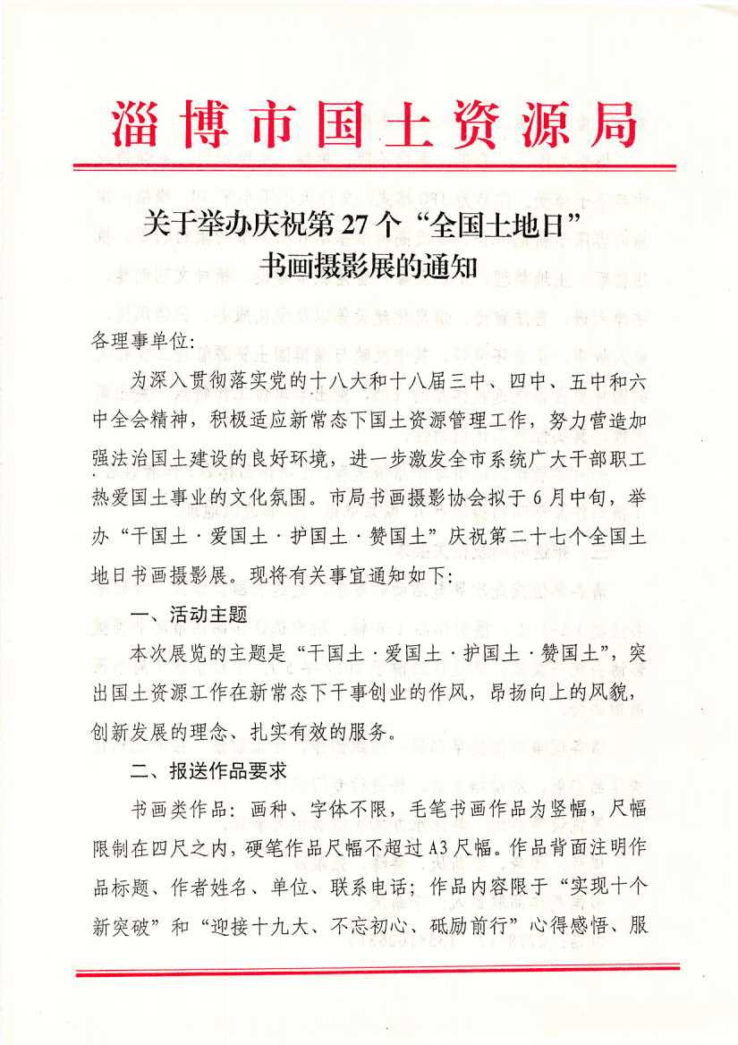 现将市局《关于举办庆祝第27个“全国土地日”书画摄影展的通知》转发给你们。请按通知要求组织本单位职工积极创作,并于5月19日前将书画作品报送局办公室,摄影作品及报送表发送至局办公室邮箱。届时县局将举办书画摄影展,并选送优秀作品,参加市局展览。报送展览情况列入年度目标责任考核。